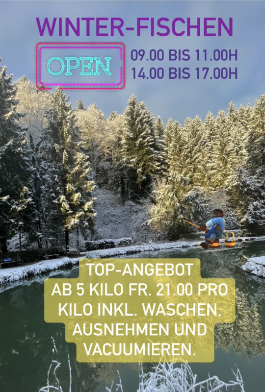 Über MITTAG (11.00 bis 14.00h) ist der Angelteich offen (für Alle die vor 11.00h kommen), das Angelhäuschen/ANMELDUNG und die Schlachterei sind dann GESCHLOSSEN, wir arbeiten über Mittag in der Beizli-Küche. Wir bedienen ab 14.00h wieder das Angelhäuschen/Anmeldung und die Schlachterei. Merci für das Verständnis.